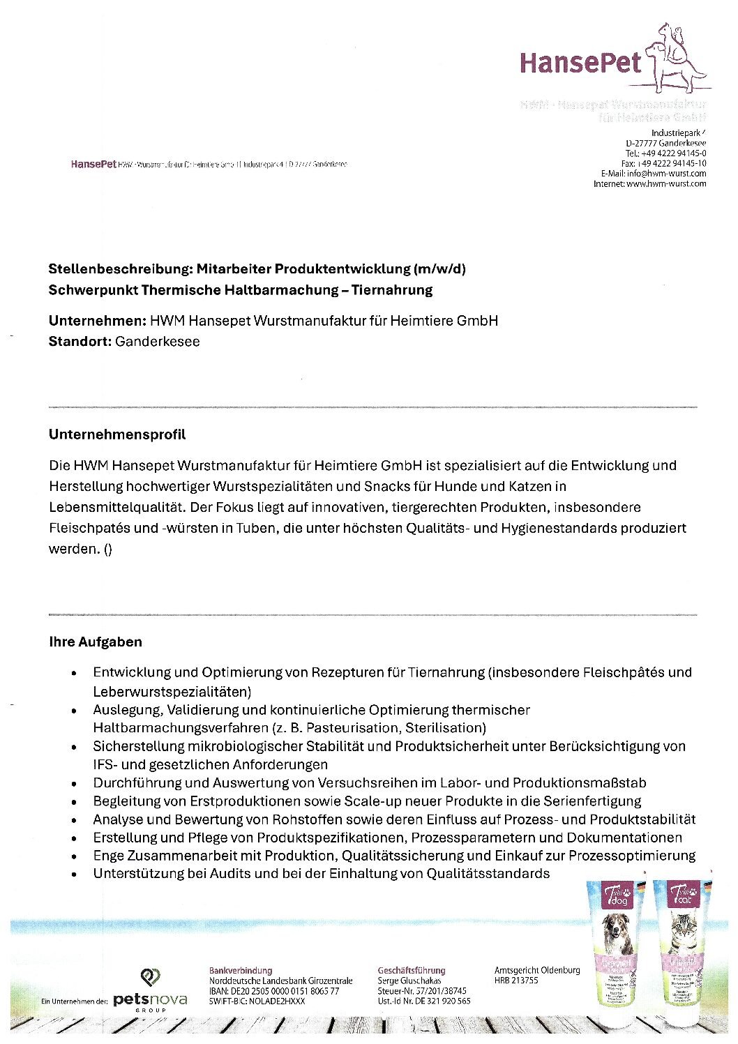 Zu Beginn unserer Geschichte lag der Fokus auf dem Einkauf von Handelswaren. Seit 2007 entwickeln und produzieren wir in unserer eigenen, modernen Manufaktur am Standort in Ganderkesee hochwertigste Snacks für Hunde und Katzen. Dort stellen wir zum Beispiel die von vielen Hunden und Katzen heiß geliebten Premium-Fleischpaté und -wurst in der Tube her. Außerdem entwickeln wir mit unserem engagierten Team und basierend auf unserer jahrzehntelangen Erfahrung immer wieder neue, tiergerechte Ideen, um unsere Vierbeiner mit den besten und innovativsten Leckerlis zu versorgen.